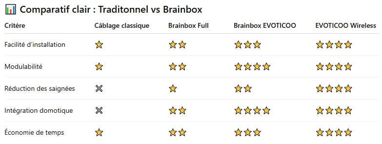 👉 L’avantage principal de ces solutions Brainbox est qu’elles simplifient drastiquement votre câblage électrique, tout en offrant une base solide pour intégrer progressivement de la domotique ou d’autres fonctions intelligentes.