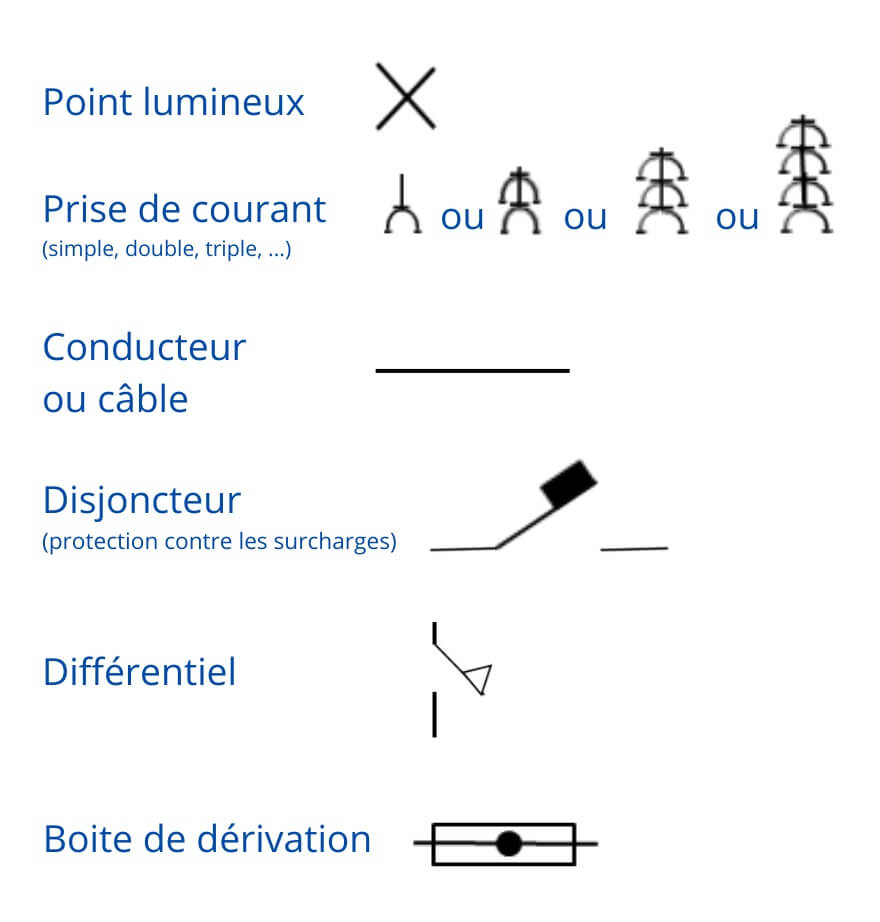 • les symboles indiquent les composants (disjoncteurs, prises, interrupteurs, etc.) ;